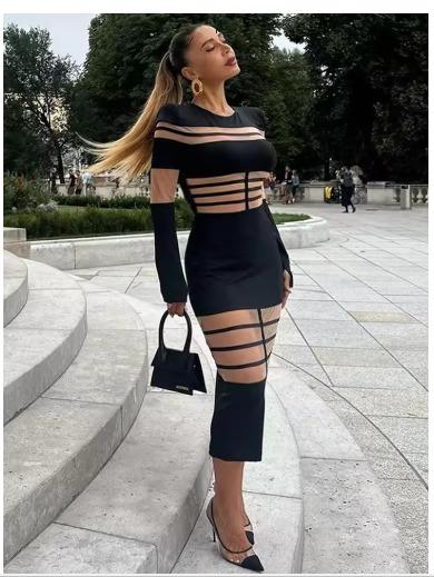 Fantoye Sexy Transparent Patchwork Solid O-Neck Female Dress Long Sleeve High Waist Skinny Fashion Streetwear Women Dress