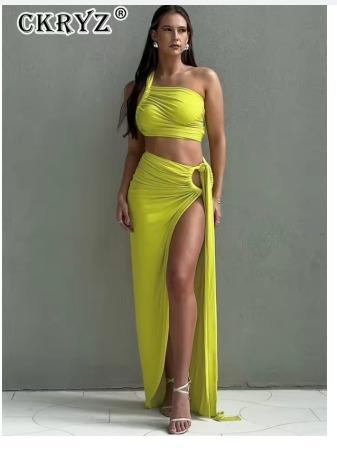 Ladies Spring 2 Pieces Sleeveless Backless Strap Spit Crop Top Side Slit Slim Fit Maxi Skirt Set Women Evening Party Clubwear