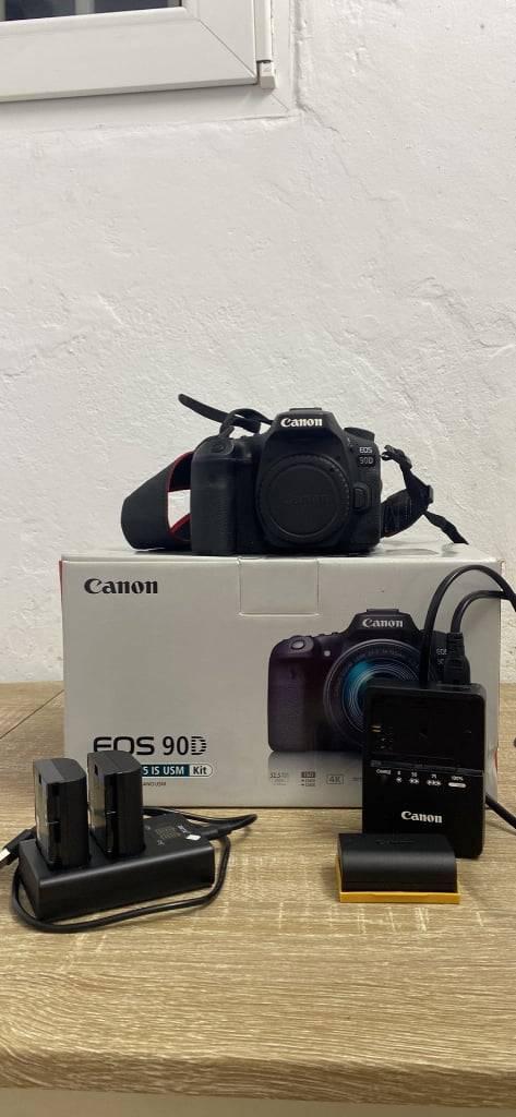 Canon 90D, simply a top-notch camera for amateurs or professionals! I've done great work with it, almost reluctant to sell it, but I no longer use it! It comes with the original box and warranty ending this year! It comes with 3 batteries, 1 original and 2 spares, all with a charger as seen in the photos, batteries that last until they can't anymore! It's in impeccable condition, very little use indeed!, , Photography: 32.5MP (definition galore), Video: 4K 30fps, FullHD 60fps/120fps (for simply brutal slow-motion), 360° reversible screen (great for selfies, and you can see the monitor because it rotates to where the lens points), Comes with an LCD protective film, LP-E6 batteries (lasts a lot, always surprised!), Wi-Fi and Bluetooth connectivity (to instantly send photos to your phone), , Any questions, just send a message! Available for viewing in person in the Porto area. For serious business, I guarantee it's as good as new, but of course, you can only truly see it by trying it out!